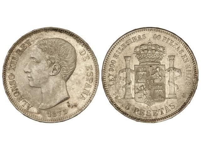 PESETA SYSTEM: ALFONSO XII - 5 Pesetas. 1875 (*18-75). D.E.-M. Restos de brillo original. (Pequeñas rayitas y golpecitos). EBC-.