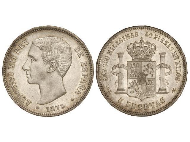 PESETA SYSTEM: ALFONSO XII - 5 Pesetas. 1875 (*_8-75). D.E.-M. (Rayitas y golpecitos en anverso). EBC.