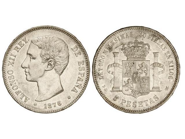 PESETA SYSTEM: ALFONSO XII - 5 Pesetas. 1876 (*18-76). D.E.-M. 1ª estrella poco visible. MBC+.