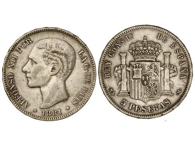 PESETA SYSTEM: ALFONSO XII - 5 Pesetas. 1881 (*18-__). M.S.-M. (Golpecitos). MBC.