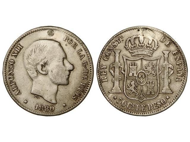 PESETA SYSTEM: ALFONSO XII - 50 Centavos de Peso. 1880. MANILA. (Perforación reparada). MBC-.