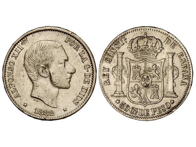 PESETA SYSTEM: ALFONSO XII - 50 Centavos de Peso. 1882. MANILA. (Leve grieta. Pequeños golpecitos en gráfila). MBC+.