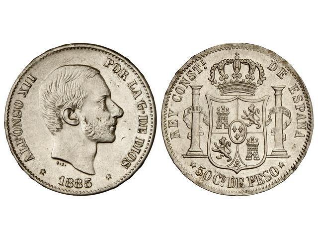 PESETA SYSTEM: ALFONSO XII - 50 Centavos de Peso. 1885. MANILA. Brillo original. (Golpecitos en anverso). EBC.
