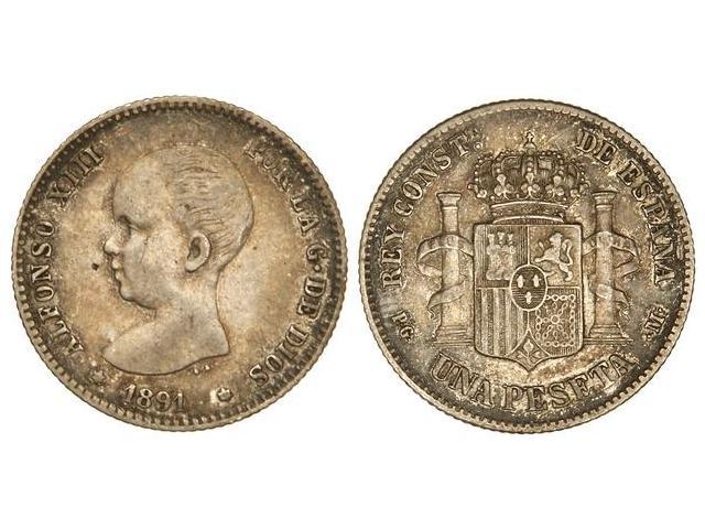 PESETA SYSTEM: ALFONSO XIII - 1 Peseta. 1891 (*__-91). P.G.-M. Cifras de la 2ª estrella algo flojas, poco visibles. Pátina. MBC.