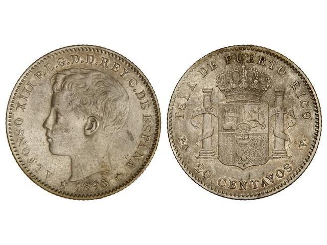 PESETA SYSTEM: ALFONSO XIII - 20 Centavos de Peso. 1895. PUERTO RICO. P.G.-V. Pátina. MBC+.