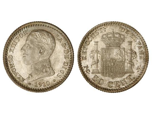 PESETA SYSTEM: ALFONSO XIII - 50 Céntimos. 1910 (*1-0). P.C.-V. Pleno brillo original. SC.