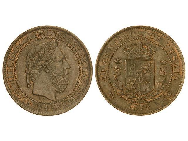 PESETA SYSTEM: CHARLES VII Pretender - 10 Céntimos. 1875. BRUSELAS. Anverso y reverso coincidentes. (Golpecitos en gráfila). Cal-8. EBC+.
