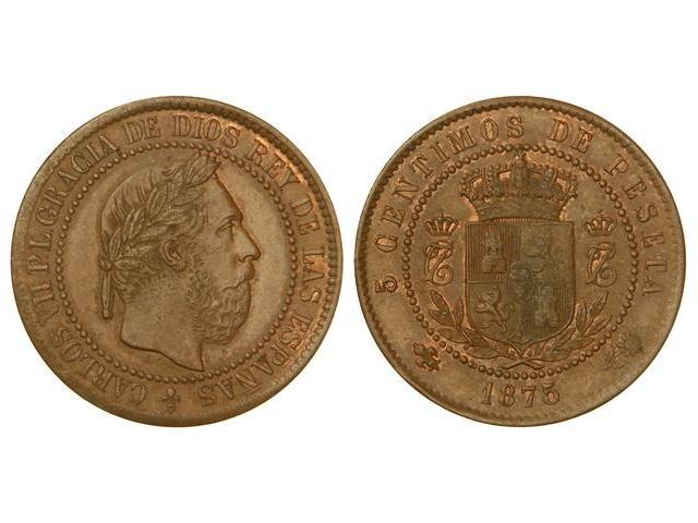 PESETA SYSTEM: CHARLES VII Pretender - 5 Céntimos. 1875. BRUSELAS. Anverso y reverso coincidentes. Gran parte de brillo original. Cal-10. EBC.