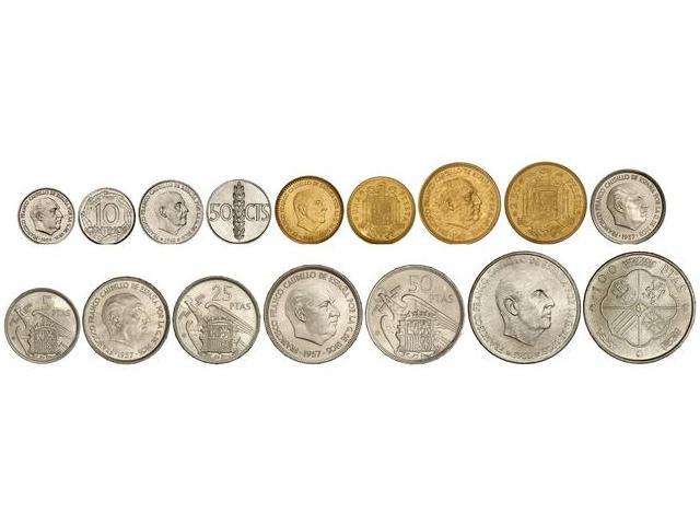 PESETA SYSTEM: ESTADO ESPAÑOL - Serie 8 monedas 10 Céntimos a 100 Pesetas. (*71). Tira original F.N.M.T. La de 100 Pesetas 1966 (*1970). PRUEBAS.