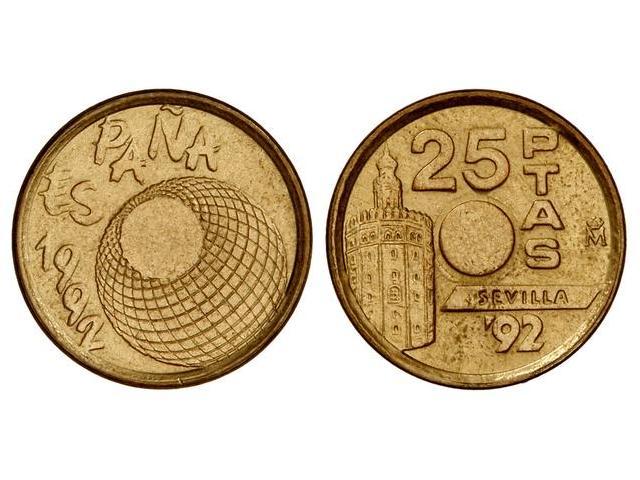 PESETA SYSTEM: JUAN CARLOS I - 25 Pesetas. 1992. SEVILLA. ERROR: Sin perforación central. EBC.
