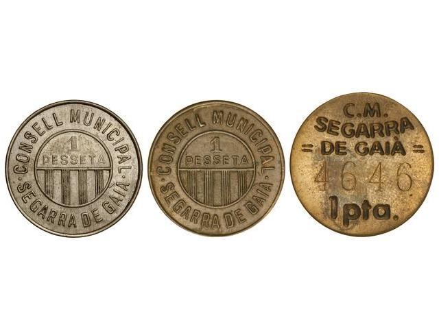 PESETA SYSTEM: LOCAL ISSUES OF THE CIVIL WAR - Serie 3 monedas 1 Pesseta. S/F. C.M. SEGARRA DE GAIÀ. CuNi, AE y latón. Vti-L41/3. EBC- a EBC.