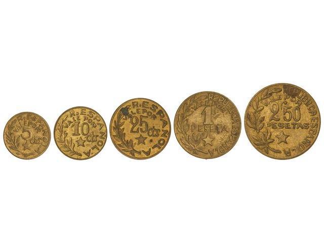 PESETA SYSTEM: LOCAL ISSUES OF THE CIVIL WAR - Serie 5 monedas 5, 10, 25 Céntimos, 1 y 2 Pesetas. 19