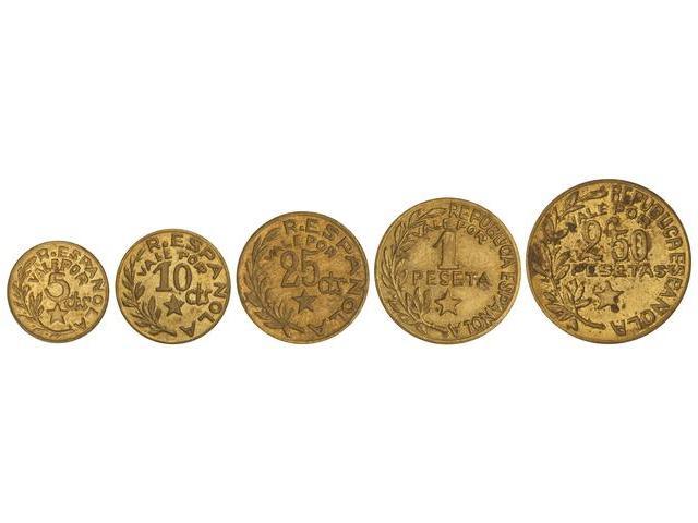 PESETA SYSTEM: LOCAL ISSUES OF THE CIVIL WAR - Serie de 5 monedas 5 Céntimos a 2,50 Pesetas. 1937. C.M. MENORCA. Latón. Serie completa. Restos de brillo. (Algunas leves manchitas). Vti-L6/0. EBC a EBC+.