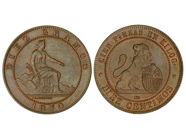 PESETA SYSTEM: PROVISIONAL GOVERNMENT AND I REPUBLIC - 10 Céntimos. 1870. BARCELONA. O.M. Bonita pátina. (Leves golpecitos en gráfila). SC.