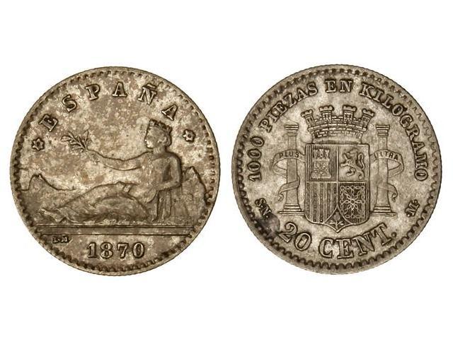 PESETA SYSTEM: PROVISIONAL GOVERNMENT AND I REPUBLIC - 20 Céntimos. 1870 (*7-0). S.N.-M. ESCASA. MBC.
