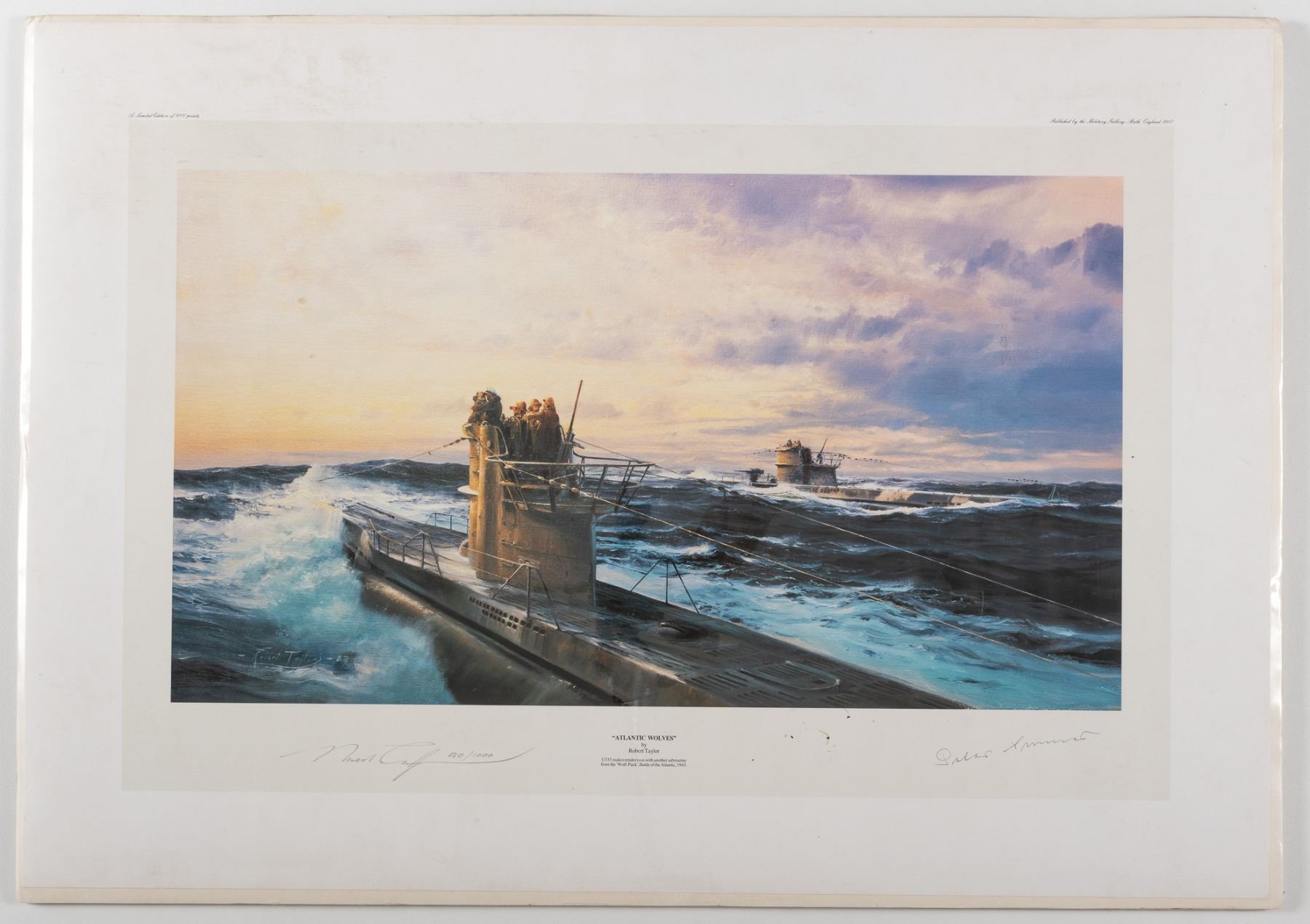 (1911-1992) Cremer was a German U-Boat commander during WWII. Print titled, 'Atlantic Wolves' by Robert Taylor, (1951- ). Published by the Military Gallery, Bath, England 1987. 22 x 31.25 inches. Print is signed by the artist Robert Taylor and Peter-Erich Cremer.