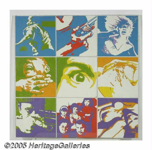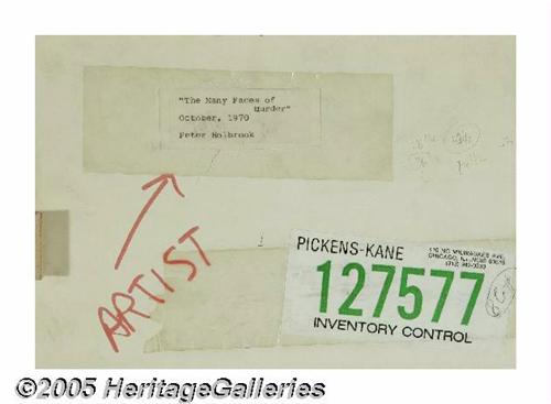 <B>PETER HOLBROOK (American b.1940)</B></I><BR>The Many Faces of Murder<BR>Acrylic on masonite<BR>36.5in x 36.5in<BR>Several exhibition stickers on reverse including Pickens-Kane, Chicago, IL and Japanese exhibition label<BR><BR>Condition Report: Nine masonite panels framed in elaborate Plexiglas frame, some abrasion damage to corners of panels, otherwise very good condition<BR>