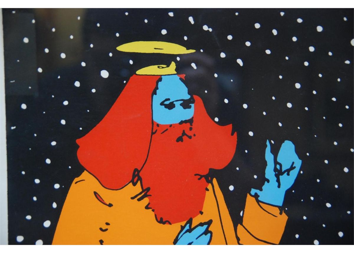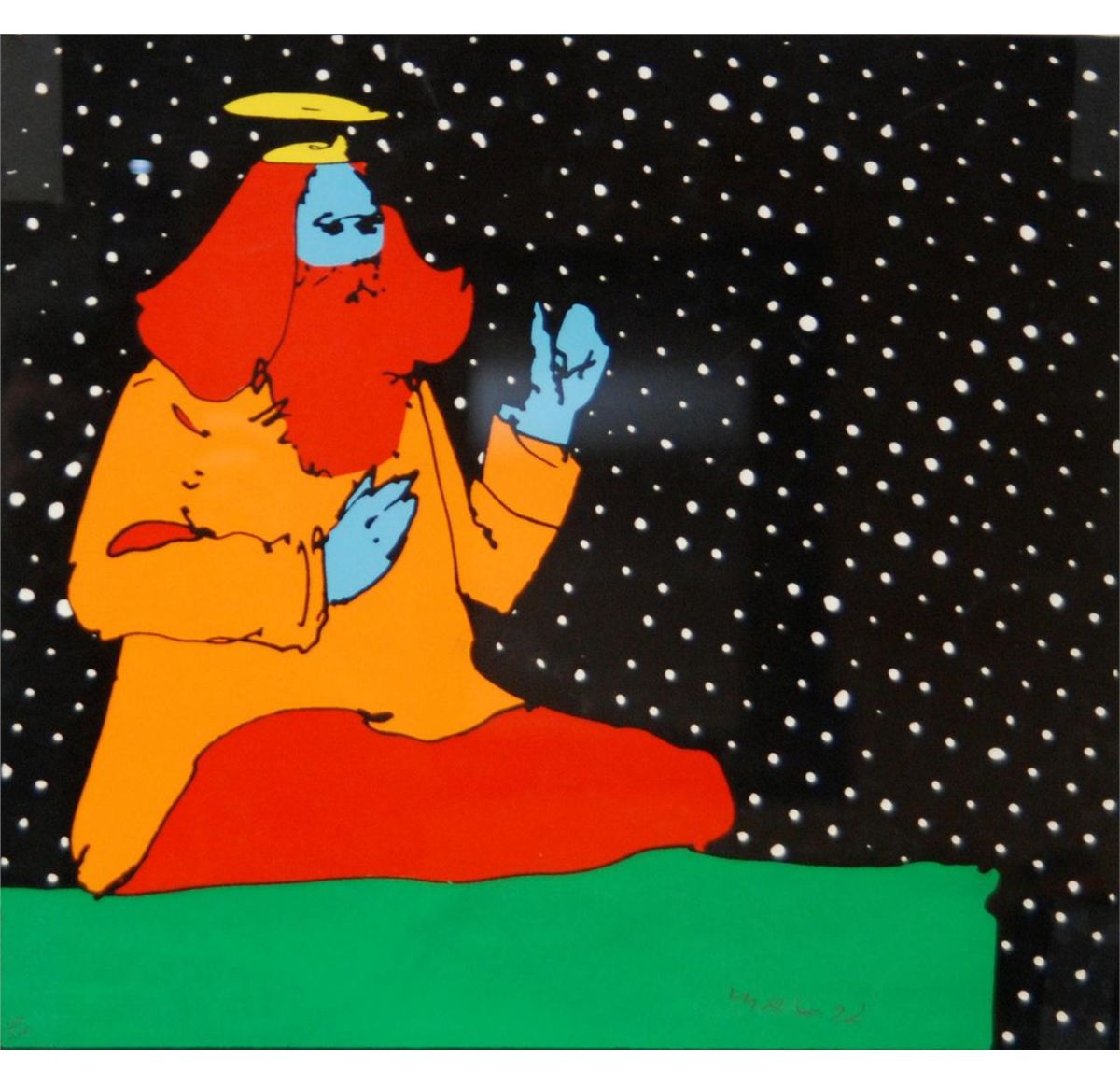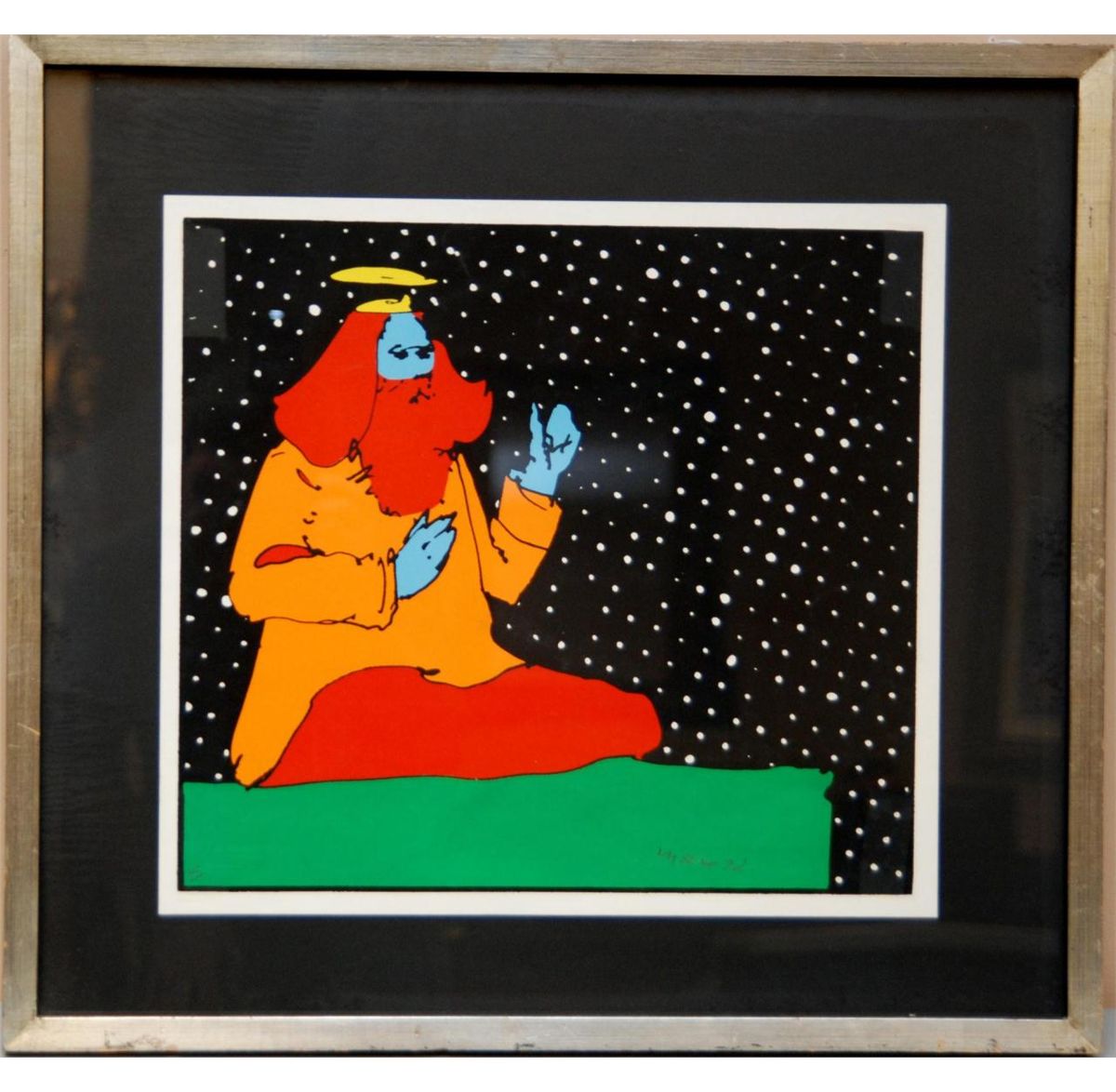 Peter Max (AMERICAN/GERMAN, 1937) framed work depicting a seated man with long beard. Has impressed marks to bottom left hand side. Pencil numbered 174/300 lower left. Pencil signed and dated '72 lower right. Measures 16 1/2" height x 18" width + 3 1/2" mat & frame (41.9cm x 45.7cm + 8.9cm).