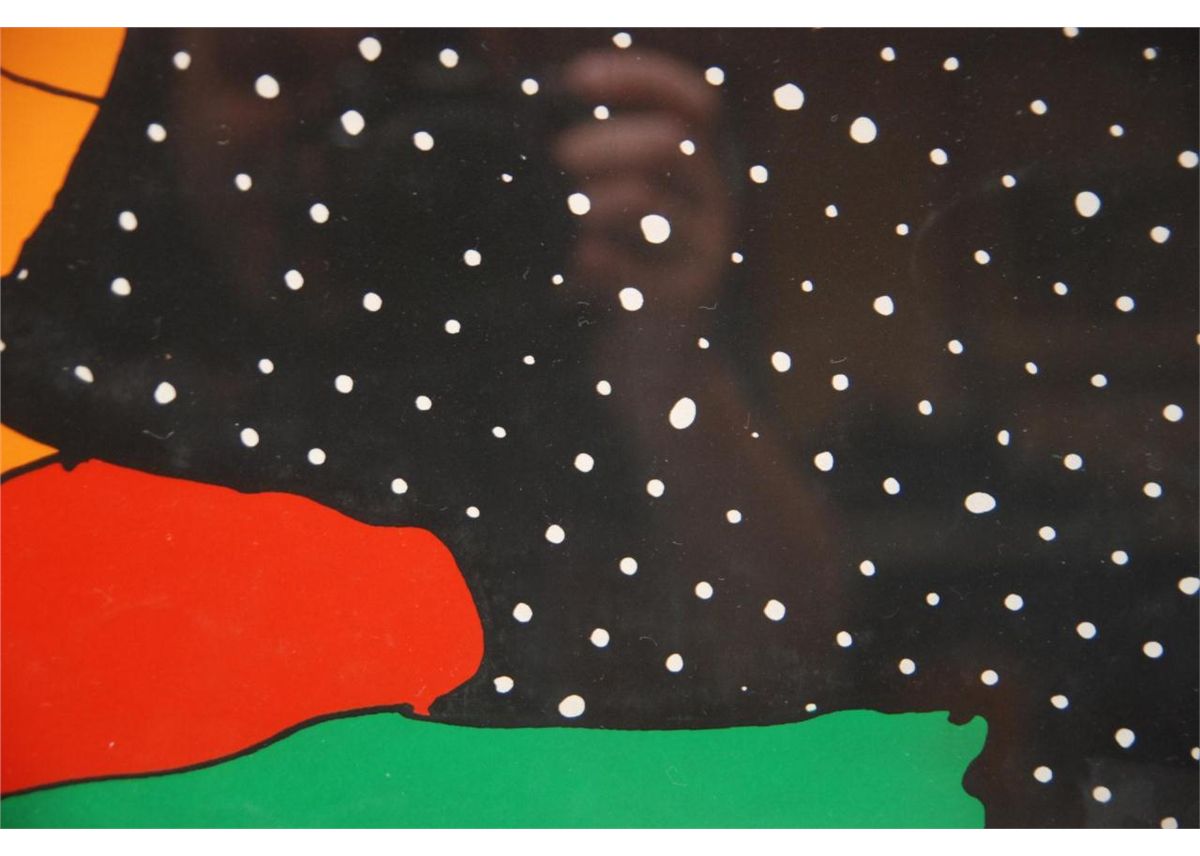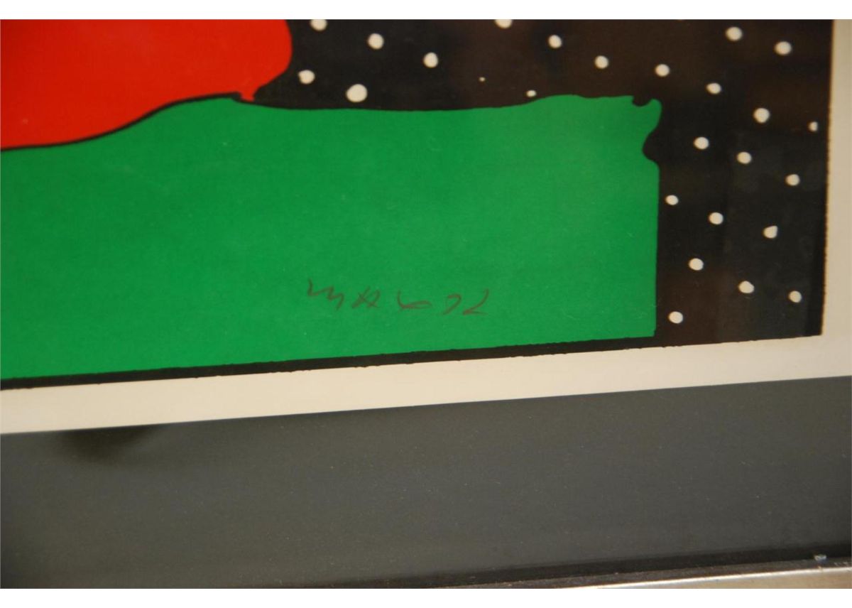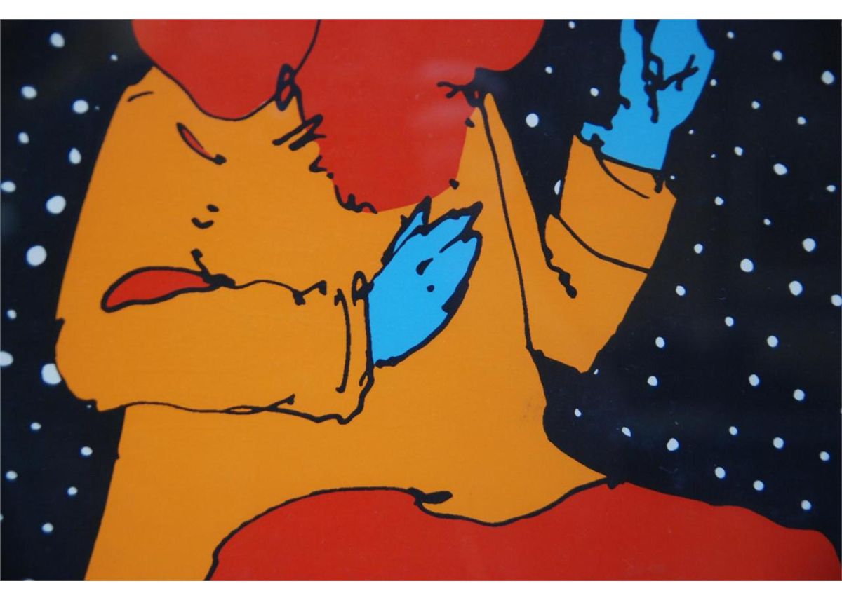 Peter Max (AMERICAN/GERMAN, 1937) framed work depicting a seated man with long beard. Has impressed marks to bottom left hand side. Pencil numbered 174/300 lower left. Pencil signed and dated '72 lower right. Measures 16 1/2" height x 18" width + 3 1/2" mat & frame (41.9cm x 45.7cm + 8.9cm).
