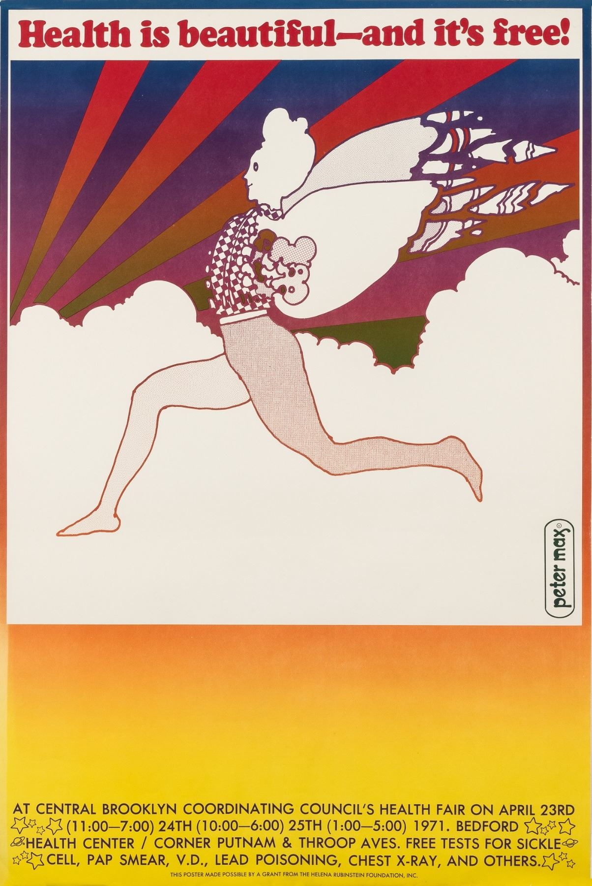 Healthcare poster made for the Central Brooklyn Coordinating Council's Health Fair in 1971, artwork by Peter Max (1937- ), German-American artist known for his works associated with the visual arts and culture of the 1960s, The Helena-Rubenstein Foundation, Inc., 1971, 36 x 24 inches. Minor tears at bottom edge and minor creases on right edge, else very good.