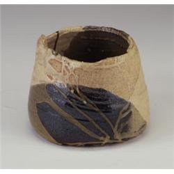 PETER VOULKOS stoneware vessel, 1971, with torn rim and punctured base, gas-fired with glossy umber and dripping beige matte glazes inside and out. A couple of small shallow flakes to rim. In glaze, VOULKOS '71. 7" x 8 1/2" $4,250 - 4,750
