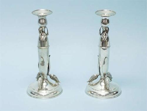 PETERSON - A pair of sterling silver candlesticks. The columnar sticks are supported with stylized magnolia blossoms on a raised circular base. Hallmarked. 9 1/4" high. Circa 1960. 2500-3000