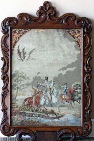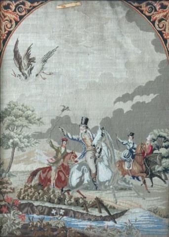 Depicts 4 men riding horses, hunting birds. Has a scrolled oak frame. Measures 26 1/2" h X 19 1/2" w + 4" matte & frame.