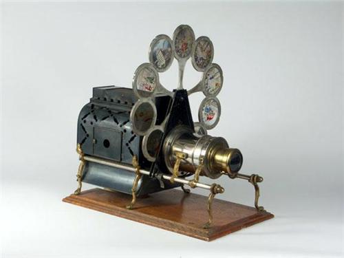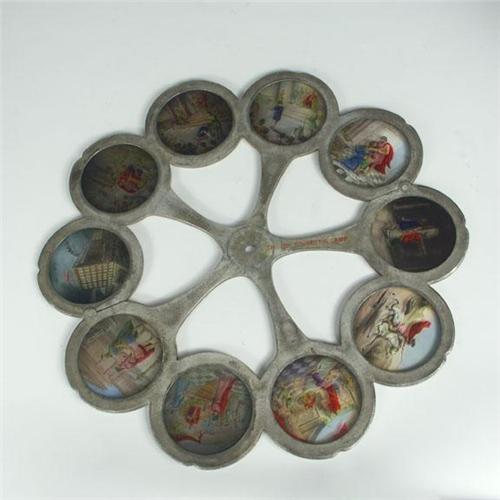 PHOTOGRAPHICA: A 'Magic Lantern'', highly collectable Lodge Lantern by Pettibone Brothers Manufacturing Company, ''Military and Society Goods', Ohio. The Arc Lodge Lantern appears to have been originally kerosene but now has been adapted for use with an electric light. The whole unit is mounted on a trimmed edge oak base and supported by gilt six brass footed arms. There are two chrome supporting side rods, with two having the original finales in place and two missing. The overall size is 21 ¼''L x 12''W x 13'' H. The lantern comes with a single wheel containing 10 scenes. The aluminum revolving disk or wheel is marked 'W. L. Smith, patented January 17, 1888 ', 'The Pettibone Brothers', with ten round 4'' frames. One frame shows the Pettibone manufacturing and retail store and nine are historical scenes of the Roman - Greek period, hand painted. Note: one glass has a faint crack. Included is the original painted wood box with hinged lid containing original instructions for use as a ''burning Sciopticon'.