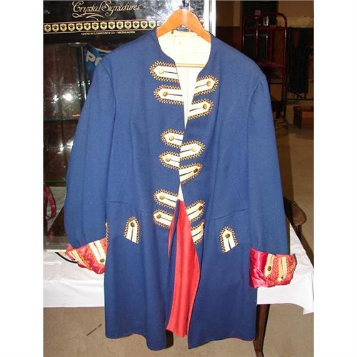 PETTIBONE BROTHERS MANUFACTURING COMPANY UNIFORM COAT. Circa Mid 20th century. Blue Colonial style coat with rolled red cuffs.