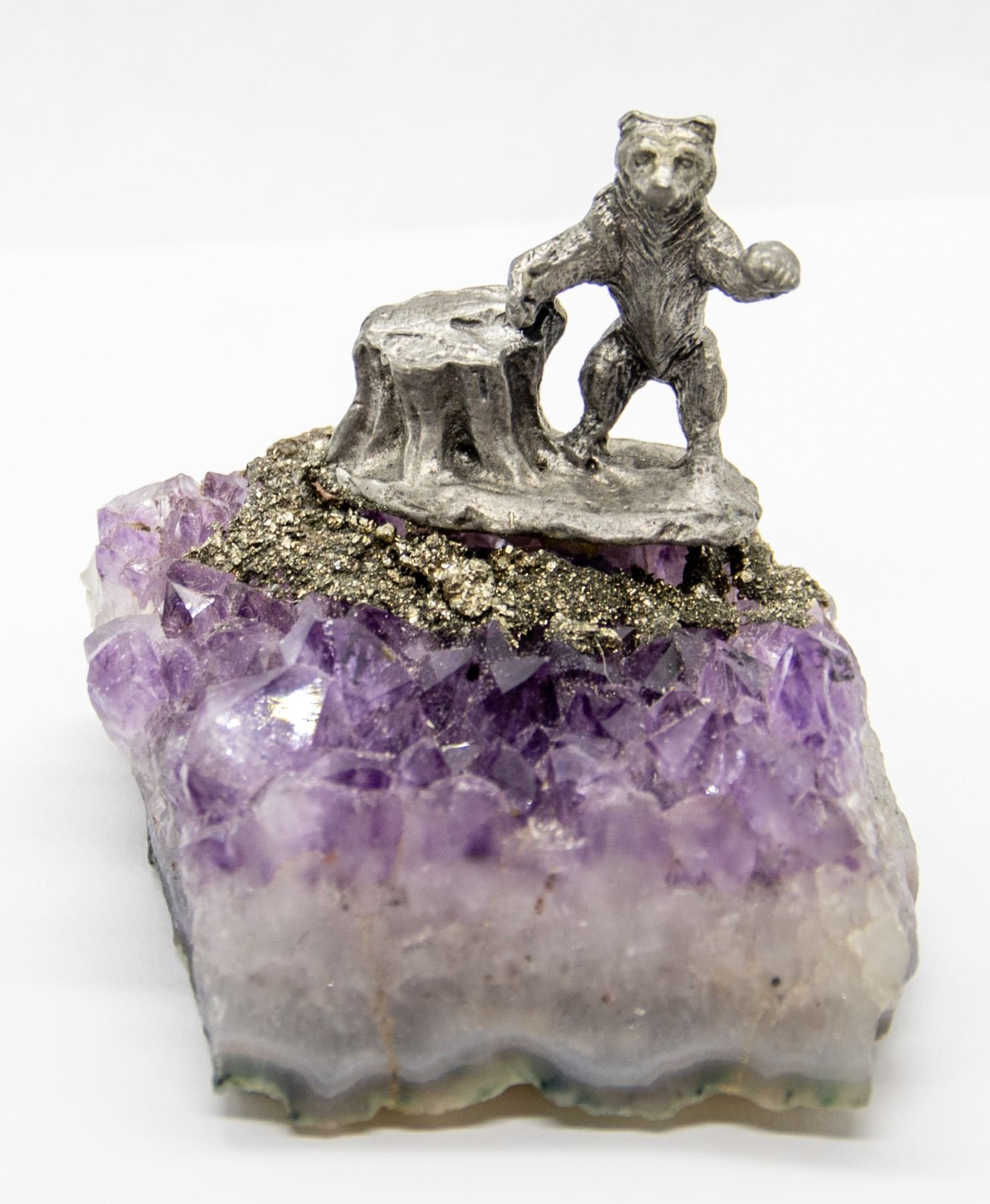 PEWTER BEAR ON AMETHYST STONE STATUE