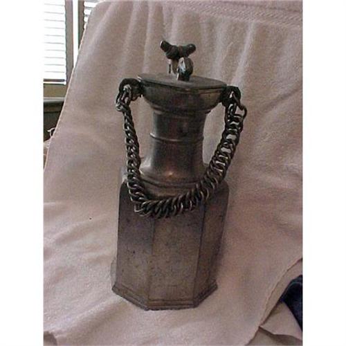 VERY UNUSUAL PEWTER CREAM OR SMALL MILK JUG MADE IN SWITZERLAND. IT IS ALL ORIGINAL AND HAS NO BREAKS OR REPAIRS. IT IS DISCOLORED AS ALL PEWTER BECOMES. NOTE THE RAM'S HEAD KNOB AND ACORN THUMBREST ON THE LID AS WELL AS THE HEAVY CARRYING CHAIN.