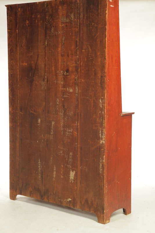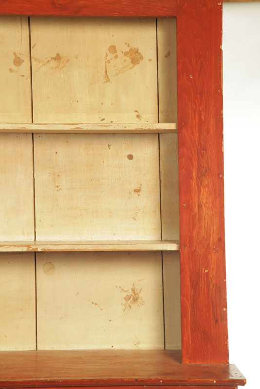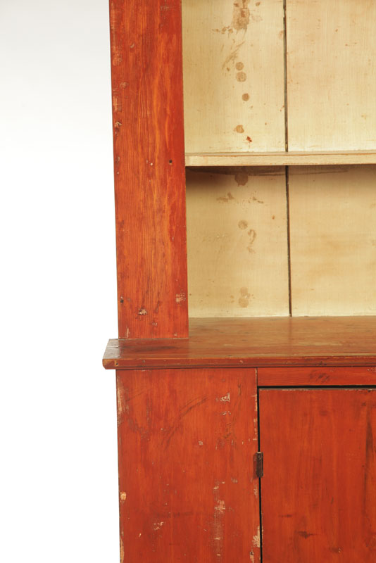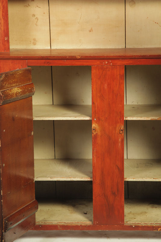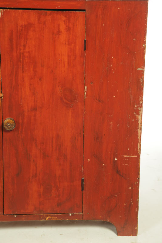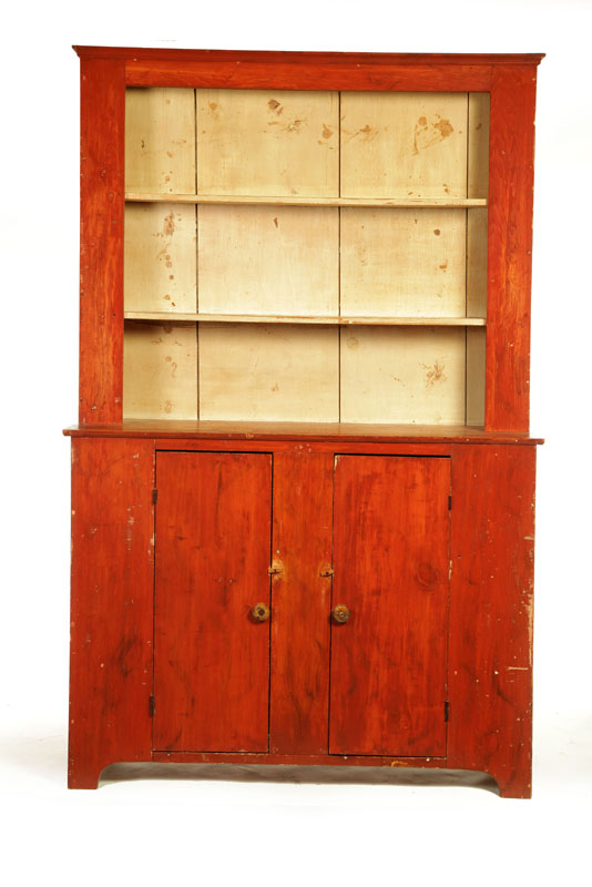 American,19th century, pine and poplar. Cutout feet, one-board doors and canted top with two open shelves. Cleaned to old red with old cream on the interior. 81"h. 52"w. 18"d.