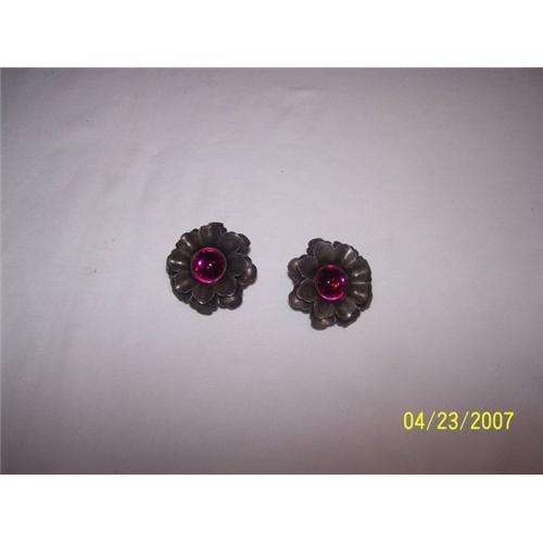 For sale is a lovely pair of Vintage Pewter-looking thick Silvertone Metal Clip Earrings with a Brilliant Fuchsia Glass Cabochon Center. The front and back are in good condition.
