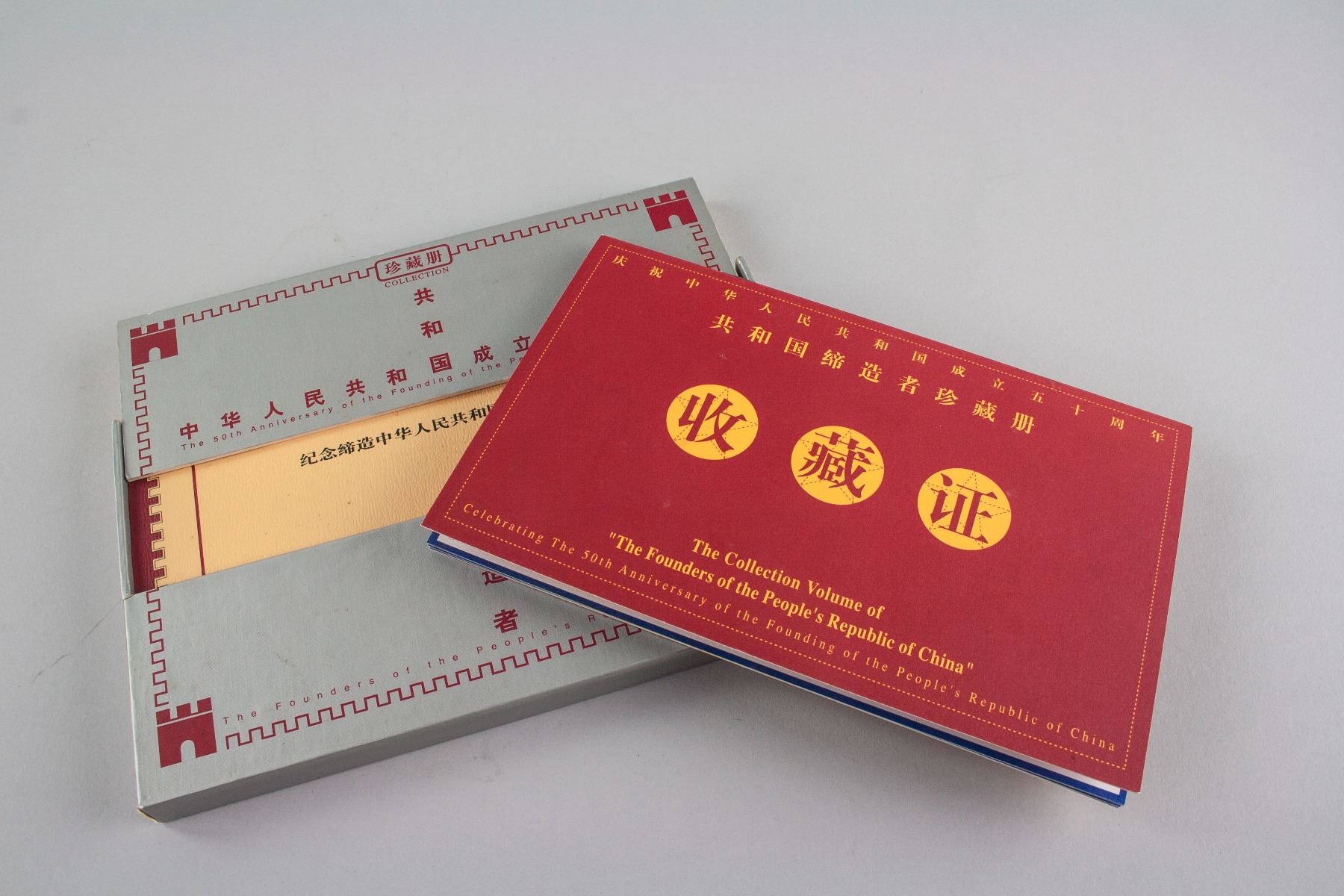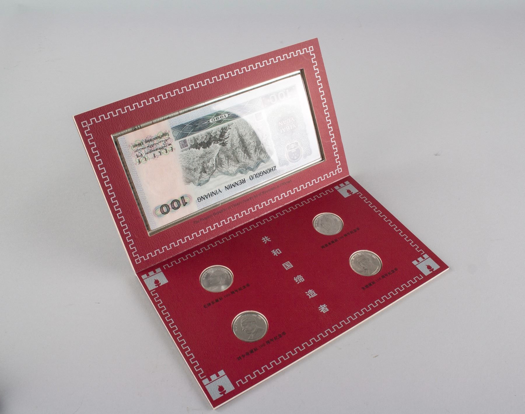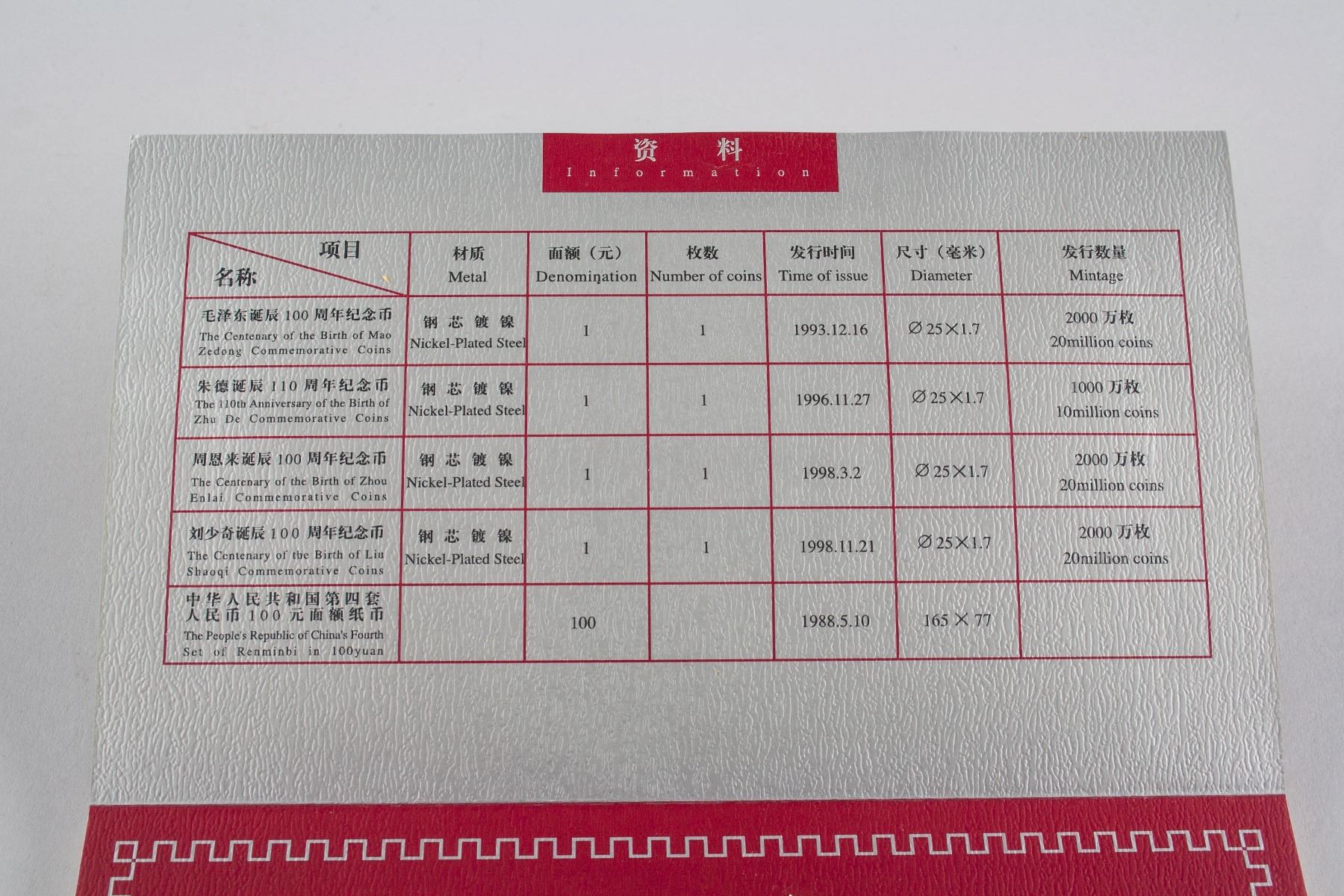 1999 China Collection book; commemorative issue the 50th Anniversary of the Founding of the People's Republic of China; 1 piece of 1988 100 Yuan bill; 1 piece of 1993 centenary of the birth of Mao Zedong nickel-plated steel coin; 1 piece of 1996 110th Anniversary of the birth of Zhu De nickel-plated steel coin; 1 piece of 1998 centenary of the birth of Zhou Enlai nickel-plated steel coin; 1 piece of 1998 centenary of the birth of Liu Shaoqi nickel-plated steel coin; with certificate; Paper: 8 cm x 16.5 cm, Diameter of Coins: 2.5 cm