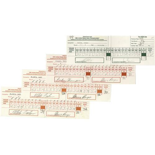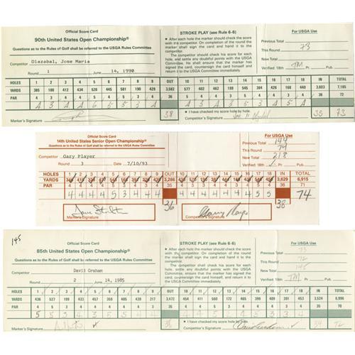 <B>1980's-1990's PGA Golf Stars Game Used & Signed Scorecards Lot of 9.</B></I> These are no mere souvenir scorecards--these are the genuine article, filled out and signed by a selection of top players on the links as they competed in some of the sport's most prestigious tournaments. Five are from various US Open Championships, used and signed by the following: David Graham (1985), Jose Maria Olazabal (1990), Curtis Strange (1991), Fuzzy Zoeller (1991), Corey Pavin (1996). The remainder represents all four days of the 1993 US Senior Open Championship as used by Gary Player. All are filled out and signed in 10/10 pencil, and about half have some degree of folding or creasing that does not hinder display value in any significant way. <I>LOA from PSA/DNA.</B></I>