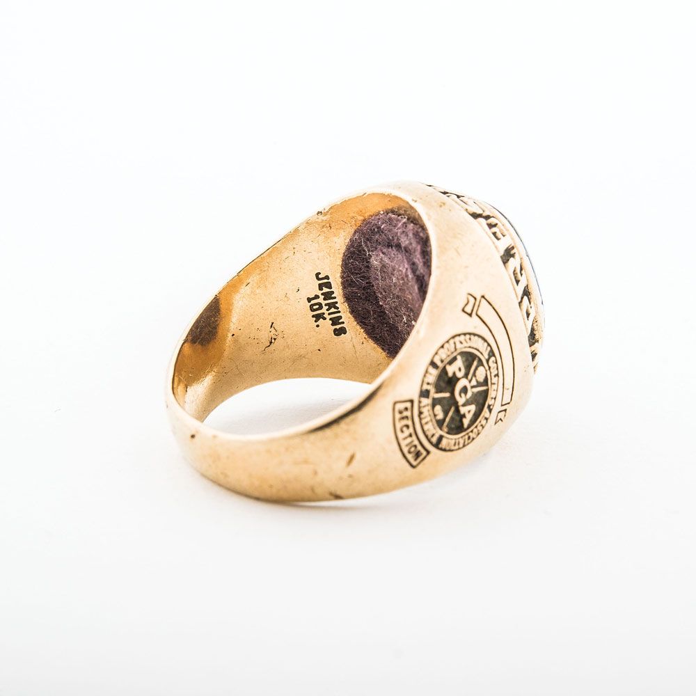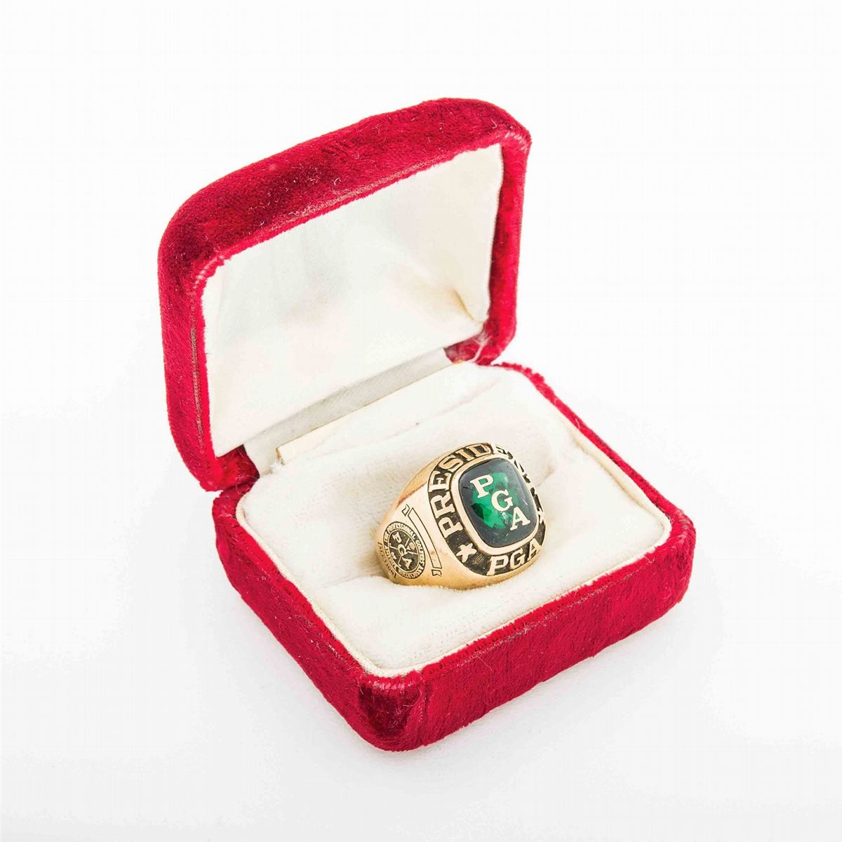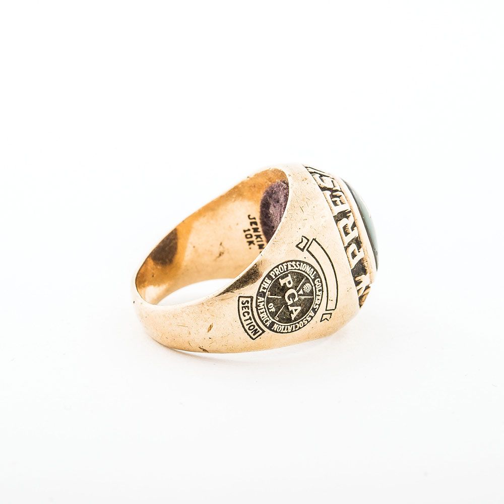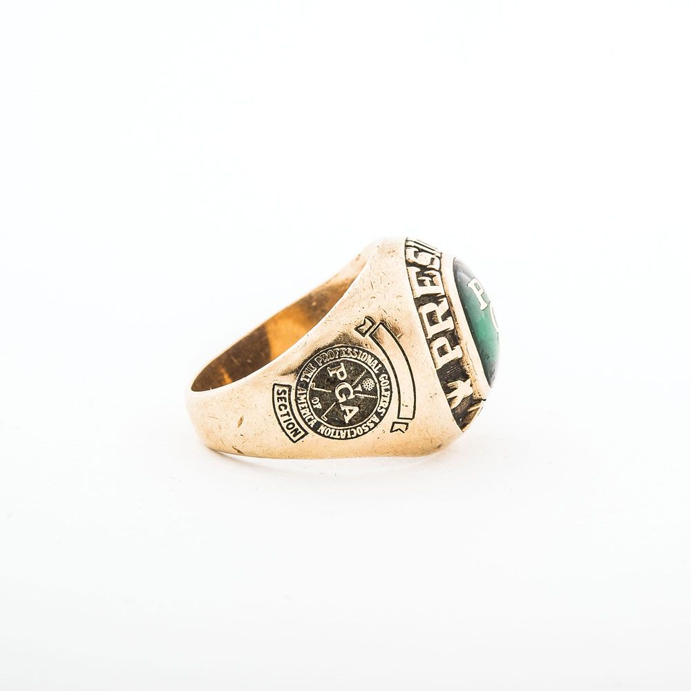 Extremely scarce solid 10K gold ring of the president of the PGA, manufactured by Jenkins, displaying a green stone on top diagonally emblazoned with “PGA” in gold lettering. The words “President” and “PGA” are prominently raised in 3D relief surrounding the perimeter of the stone, with the meticulously detailed PGA logo emblem engraved on each shank. Beautiful to behold, the ring is of the finest workmanship and the first of its kind we have ever offered.