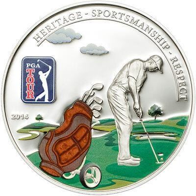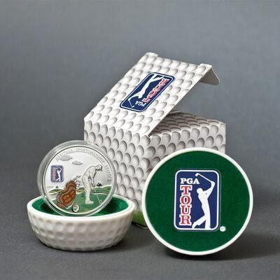 PGA Tour 925 Sterling Silver $5 Coin in Golf Ball Display - LE/2500 Proof 3d Leather Golf Bag Insert in Coin