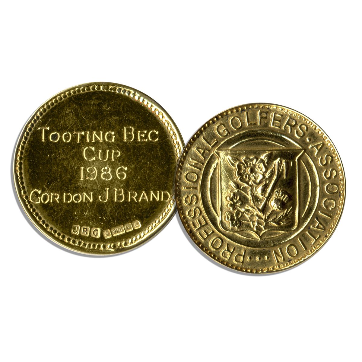 Gold Tooting Bec Cup medal bestowed upon Gordon J. Brand by the PGA at the 1986 British Open. Brand's scoring lowest in a single round in the Open Championship that year with a score of 68, together with his requisite UK heritage earned him the Tooting Bec Cup. Measures nearly 1''. Weighs 6 grams, or 0.21 ounces. Gold medal is near fine. With an LOA from Gordon Brand.