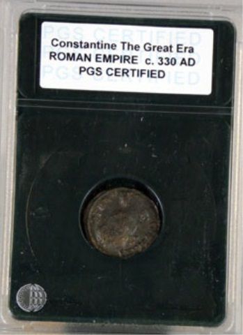 circa 330 all in very nice condition PGS certified bronze coin, Constantine the Great on front with 2 soldiers on obverse