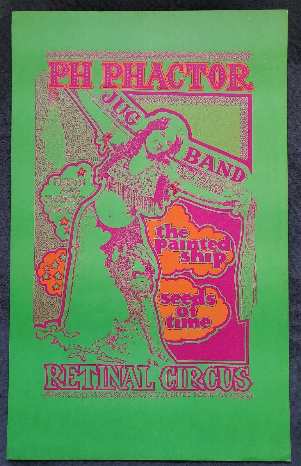 This is an original pre-concert poster by Canadian artist Eric Fisher, for October 1968 performances at the Retinal Circus in Vancouver, BC, Canada, by PH Phactor Jug Band, Painted Ship and Seeds of Time.