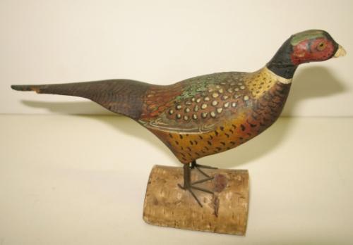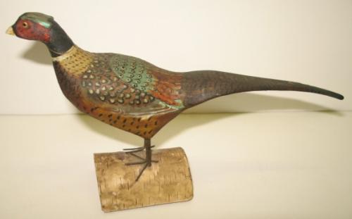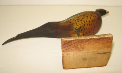 WOODEN CARVING OF PHEASANT. Attached to wooden base. Loss to wood at tail. 4.75” H, 8” L