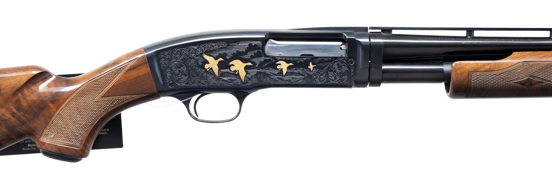 PUMP ACTION SHOTGUN WITH MATCHING FACTORY BOX. Cal. 410, 2 1/2" & 3". S# 00519NZ982. Bbl. 26". Model 42 High Grade pump action shotgun mfg. in Japan and imported/retailed by Browning Arms Company. Left side of the bbl. is marked with the model and cal. designations, followed by "FULL", with Browning's importer information above "MADE IN JAPAN" marked on the right. Left side of the receiver features scroll engraving, as well as a scene of 2 gold plated hunting dogs and a gold plated partridge, with the right side featuring matching pattern scrollwork and a scene of 4 gold plated ducks. Metal components exhibit a blue finish overall, save for on the bolt, which is polished in-the-white. High grade and high gloss finished checkered wood pistol grip buttstock and pump, with blued steel grip cap and Browning textured black synthetic buttplate. Bbl. features a grooved matte V/R, with an aluminum bead front sight. UNATTACHED ACCESSORIES: matching factory box. CONDITION: near new, with metal components retaining virtually all of their original factory blue finish, and retaining a thin layer of grease overall. Mirror bore, exhibiting factory grease throughout. Wood furniture is excellent overall. Box shows light to mild wear from handling and storage, but otherwise remains sturdy and serviceable. PROVENANCE: Estate of Russell Dickerman. (25-1967/MLW). MODERN. $1,200-1,800.