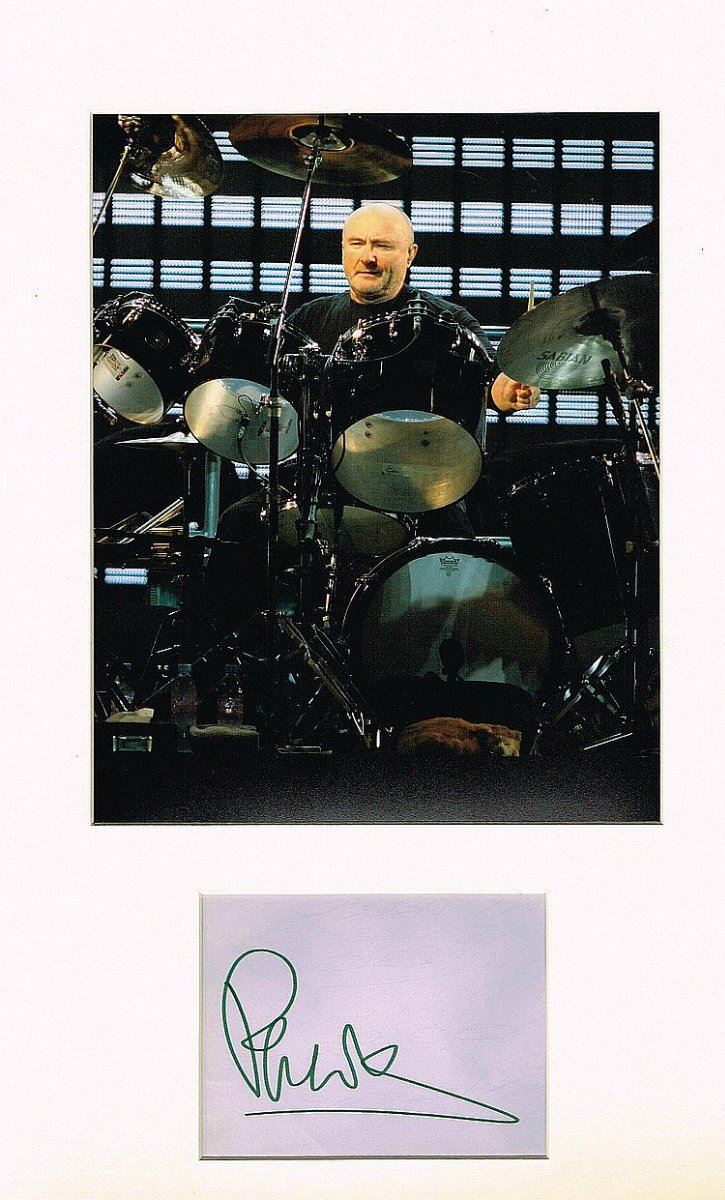 A piece of paper signed by Phil Collins. Together with a photo of him playing the drums in a cardboard mount. Collins is one of the most successful songwriters and performers of all time, singing the lead vocals on dozens of hit albums and singles in the UK and the US between 1976 and 2010, either as a solo artist or with Genesis. His solo singles, sometimes dealing with lost love and often featuring his distinctive gated reverb drum sound, ranged from the atmospheric In the Air Tonight, dance-rock of Sussudio, piano-driven power ballad Against All Odds, to the political and religious connotations of Another Day in Paradise. Collins has been described by AllMusic as "one of the most successful pop and adult contemporary singers of the '80s and beyond Condition Report: Very good.