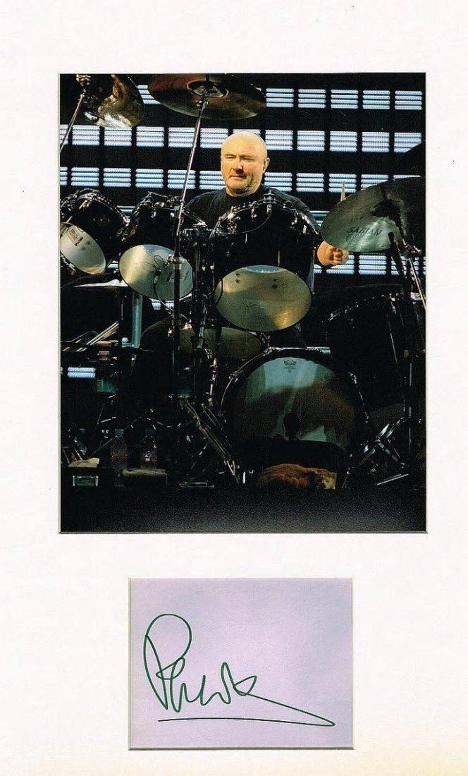 A piece of paper signed by Phil Collins. Together with a photo of him playing the drums in a cardboard mount. Collins is one of the most successful songwriters and performers of all time, singing the lead vocals on dozens of hit albums and singles in the UK and the US between 1976 and 2010, either as a solo artist or with Genesis. His solo singles, sometimes dealing with lost love and often featuring his distinctive gated reverb drum sound, ranged from the atmospheric In the Air Tonight, dance-rock of Sussudio, piano-driven power ballad Against All Odds, to the political and religious connotations of Another Day in Paradise. Collins has been described by AllMusic as "one of the most successful pop and adult contemporary singers of the '80s and beyond.