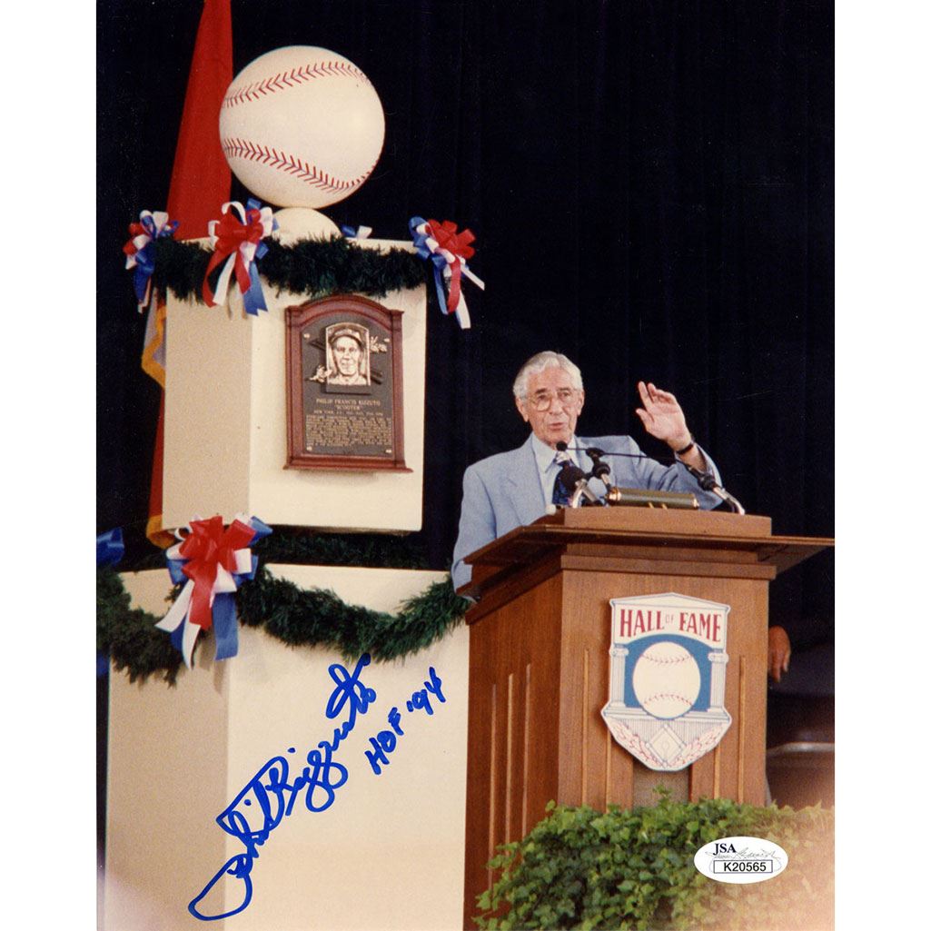 PHIL RIZZUTO NEW YORK YANKEES AUTOGRAPHED 8X10 PHOTO IN **|**|** Yankees' great Phil Rizzuto has personally hand-signed this 8x10 Photo and inscribed it "HOF"-Phil Rizzuto was the Yankee shortstop for 10 of the Yankees' 27 World Championships. The Scooter was an excellent fielding shortstop and was clutch at the plate. Phil was the Yankees announcer for many years after his playing days were over and patented the phrases 'Holy Cow' and 'He's a huckleberry. This Phil Rizzuto autograph is guaranteed authentic by JSA.