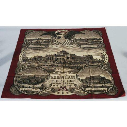 PHILADELPHIA 1876 CENTENNIAL HANKERCHIEF, 26"x25",, CONDITION REPORT: strong color to front, verso with rust stains., PACKING/SHIPPING within continental U.S. excluding insurance (which is required) will be handled by Fairfield Auction for $20,