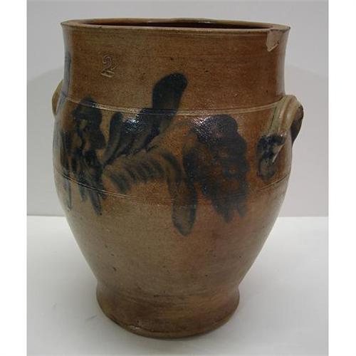PHILADELPHIA BLUE DECORATED STONEWARE OVOID JAR. Attributed to R.C. Remmey. 12” high. Chips to rim and handles, overall cinnamon color.