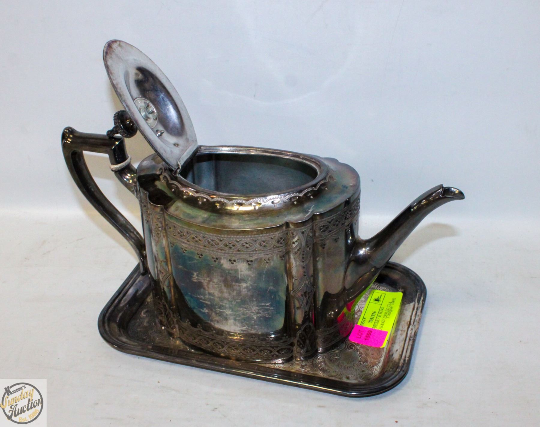 KETTLE WITH PREPARED BOTTOM, BRITTANNIA TRADE MARKED, STAMPED 5 4491 B, EXPANSION BOTTOM. SOLD WITH ESSAY CANADA EP COPPER PLATED TRAY **ALL ITEMS MUST BE REMOVED BY 5PM SATURDAY, SEPTEMBER 6TH 2025. ALL REMAINING ITEMS WILL BE SUBJECT TO A $6.00 PER DAY STORAGE CHARGE. ANY ITEMS REMAINING AFTER MONDAY, SEPTEMBER 22ND 2025 WILL BE CONSIDERED FORFEITED. NO REFUNDS WILL BE ISSUED FOR FORFEITED ITEMS. TO SCHEDULE A PICK UP APPOINTMENT CLICK HERE