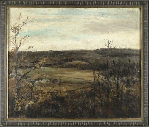 PHILIP WASS BROWN (American, Mid-20th Century) "BAD FISH VALLEY" DOVER-FOXCROFT, MAINE. Oil on canvas landscape scene shows a flat valley between low hills having several houses and field. Unsigned canvas but identified and titled on frame. Housed in a modern carved wood frame with gold liner. SIZE: 26" x 31". CONDITION: Craquelure, generally good. 9-27274