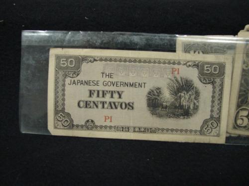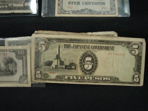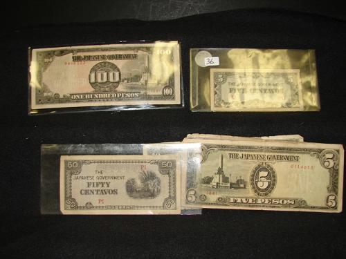 PHILIPPINES FOREIGN CURRENCY LOT. Consists of one 100 pesos note, (2) 10 pesos notes, (2) 5 pesos notes, one 50 centavos note, and one 5 centavos note. All notes are marked “The Japanese Government”.